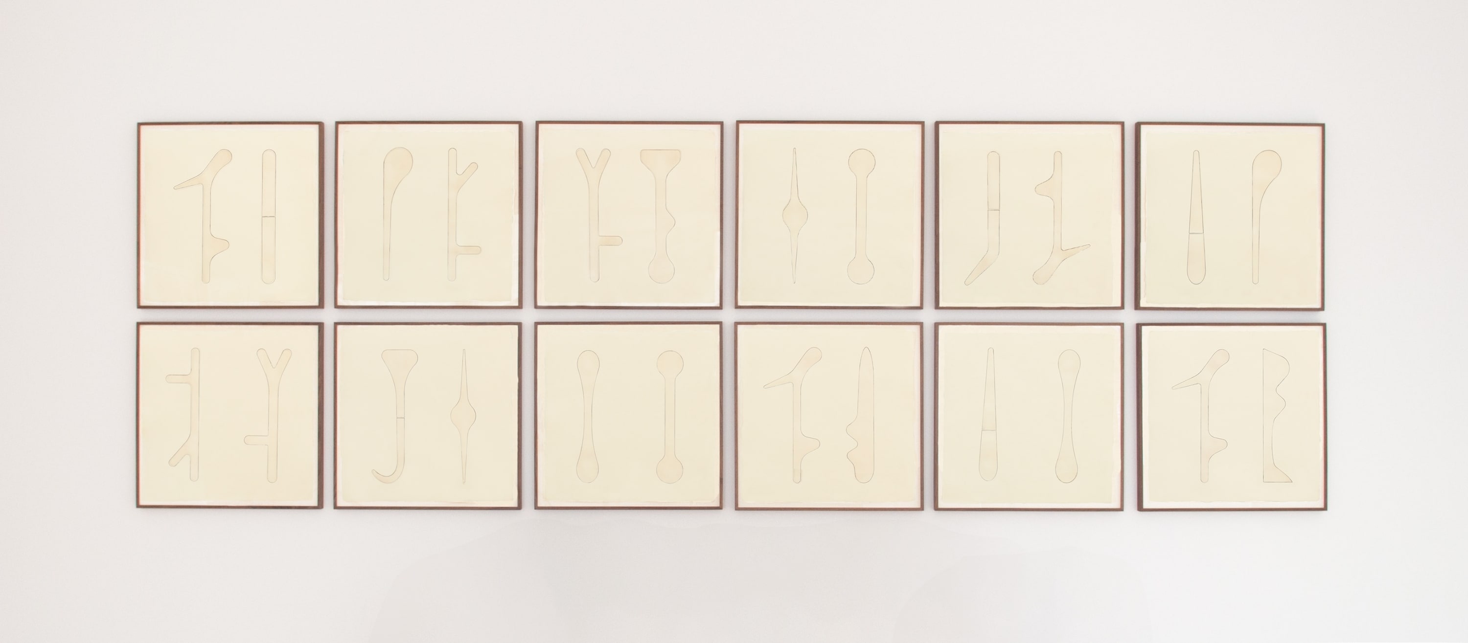 Altars, Michael Heizer’s portfolio of twelve intaglio prints with Durham Press, translates the monumental installations the artist is known for into a far more intimate scale. Each of the twelve 20 ¼ inch square prints depicts two discrete shapes that recall rudimentary tools or ideographic letters and have been compared to cattle brands. These same symbols occur in Heizer’s other work such as in the massive steel sculptures that were exhibited in 2015 at Gagosian Gallery, New York, as well as his ongoing land art piece titled City in Nevada, a 1.5 mile stretch of land carefully mapped out with complex excavations and structures which Heizer began in the 1970s.