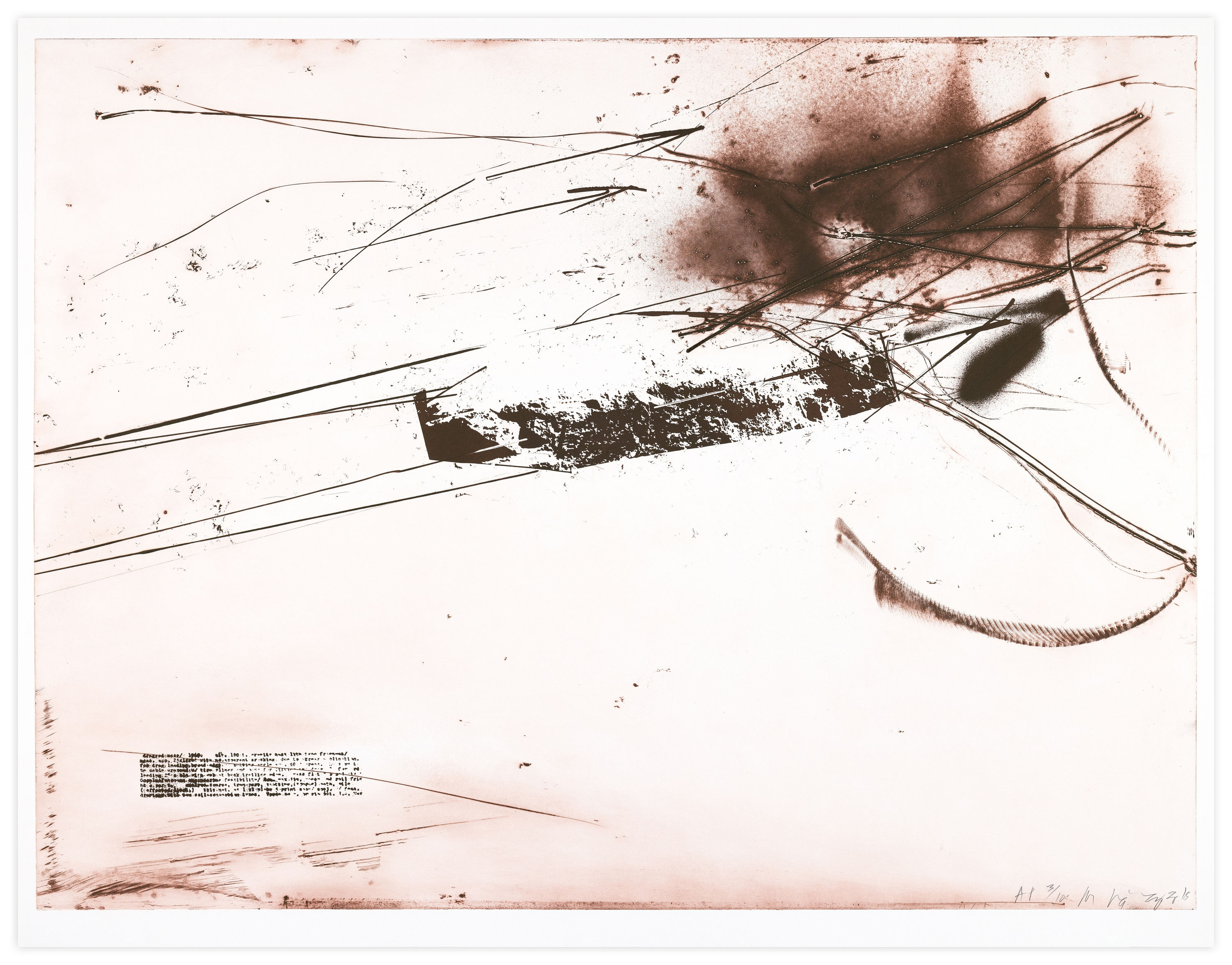 Like much of the artist's work, including this print's predecessors, Dragged Mass was shaped by a tremendous amount of effort and force. At his ranch in Nevada, Heizer, alongside Jean-Paul Russell, Curt Weihz, and Neil Curry, employed unconventional techniques as a form of mark making, using many of the same tools used to create his sculptures, such as the initial 1971 inspiration for this print. The plate was sandblasted, scraped with gravel, hit with a belt grinder, and scratched with an etching needle mounted to a CAT 960 loader - acts of assertive and unreserved mark making. Mounting an etching needle on a loader – essentially drypoint on an industrial scale – echoes the movement of earth undertaken in Detroit over forty years ago. Drypoint, akin digging a hole, is an act of displacement. There is the gouge in the copper but also the raised burr; the pit in the ground but also the pile of dirt. On top of these unorthodox methods, Dragged Mass includes more traditional printmaking techniques to add imagery that more closely recall Heizer's initial sketch including photoetchings made directly from the drawing.